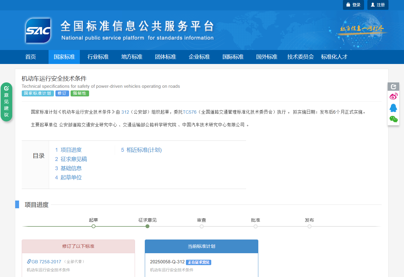 11月12日,公安部组织起草的国家标准计划《机动车运行安全技术条件》向社会征求意见。该标准主要起草单位有公安部道路交通安全研究中心、交通运输部公路科学研究院、中国汽车技术研究中心有限公司,拟在征求意见稿发布后6个月正式实施,替代现行的GB7258。