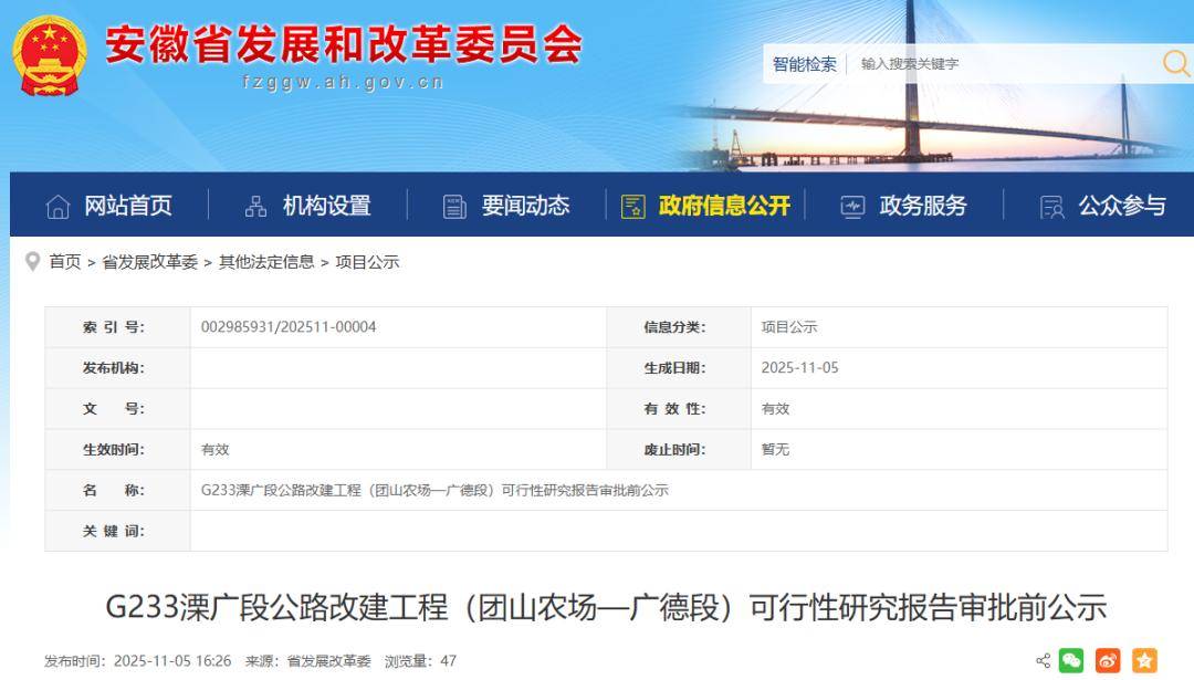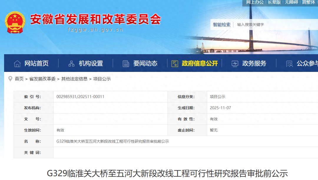现将G329临淮关大桥至五河大新段改线工程可行性研究报告审批内容予以公示。公示时间自公示之日起10个工作日(11月7日—11月20日),如有意见和建议,请以来人或署名来信(包括电子信函)方式向省发展改革委基础设施发展处反映,并提供姓名及联系电话,对匿名方式提出异议的不予受理。